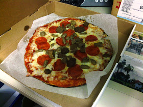 Maybe if that one person is a Sumo Wrestler or an athlete who eats a lot but burns a lot of calories, too.  This so-called personal pizza is the size of a small at most places.  It has 6 slices and covered in stuff.  Well, not really covered.  I got what they call a Trilogy which has sausage, pepperoni, crumbled meatballs and cheese and red sauce.  Huh.  Interesting concept to put cheese and red sauce on a pizza.  Especially one that comes with sausage and pepperoni.  I can see the need to list the type of cheese and sauce if it was a "white" pizza or something with chicken on it, but not a standard topping-type pizza.  The price was decent.  The employees were friendly.  The pizza isn't all that spectacular, though.  I think I'll stick with Pizza Hut and Papa John's.  Oh, and the way they cooked it left black stuff on my fingers.  Like charcoal powder.  That's no fun when you spend the day typing on a computer.  The sausage is a little too spicy for my liking, too.  Maybe my mom will like it.